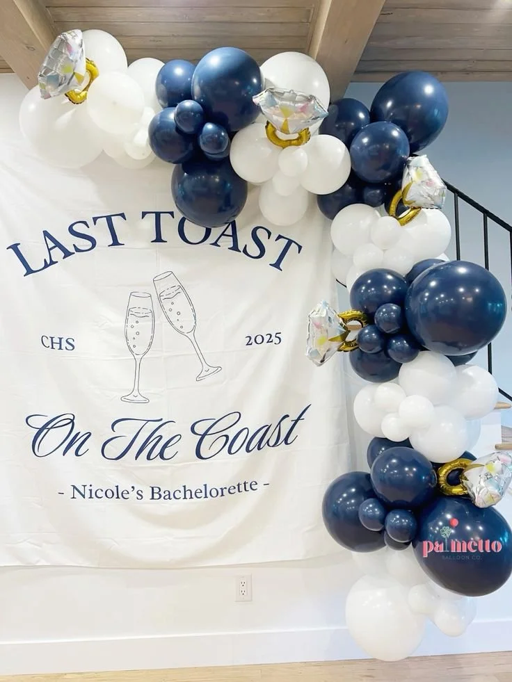 If you’re “feeling nauti” or love a more traditional coastal theme, navy and white are classics for a balloon garland and look particularly striking with these gold diamond engagement ring foil accent balloons. Again, this was perfection in this Isle of Palms beach rental.