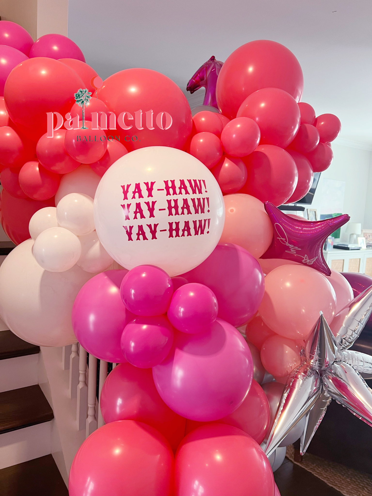 Coastal Cowgirl is a fun riff on a classic Western theme, and all hail Queen Dolly. Maybe it’s the Tennessee girl in me, but I’m a sucker for rhinestone cowgirl boots, denim and fringe. Once again, pink is an easy go-to — and these pink pony balloons are THE CUTEST. For this Dolly Parton party, the guest of honor loved to say “YAY-HAW” instead of “Yeehaw” so we created custom vinyl to tie in that fun little detail.
